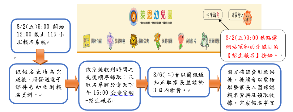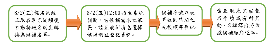 2.  8/2()12:00過後招生報名系統關閉,請有候補需求之家長至最新消息點選候補網址連結處填寫幼生資料,感謝各位家長的支持與愛護!