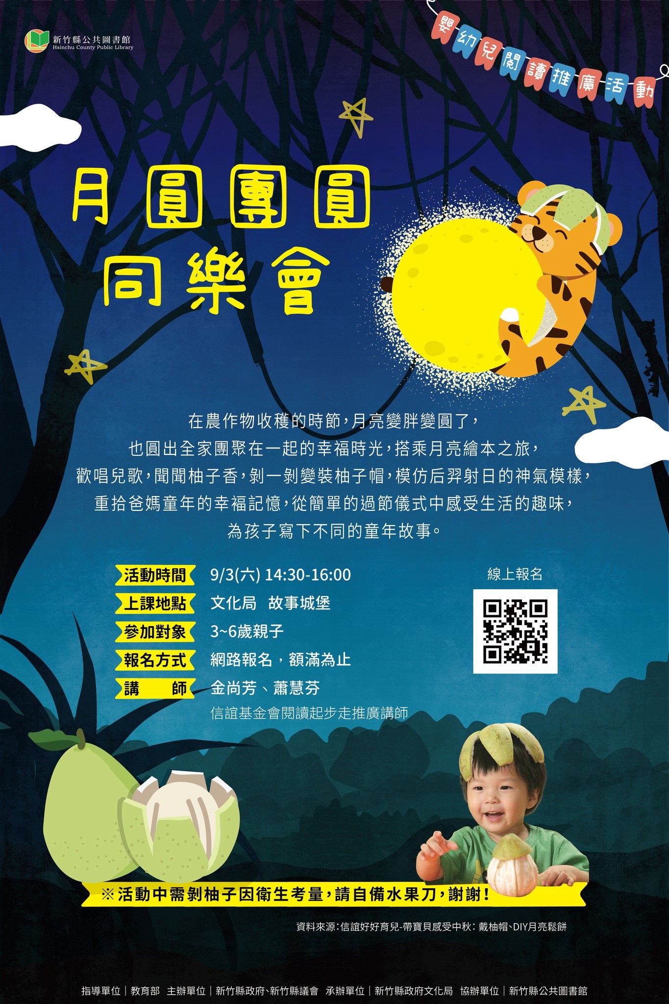 搭乘月亮繪本之旅,歡唱兒歌,聞聞柚子香,剝一剝柚子變成帽子,模仿后羿射日的神氣模樣,重拾爸媽童年的幸褔記憶